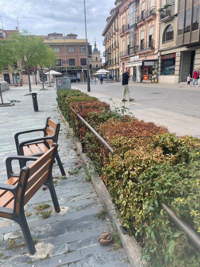 En la plaza Santocildes, setos secos ante la falta de agua.